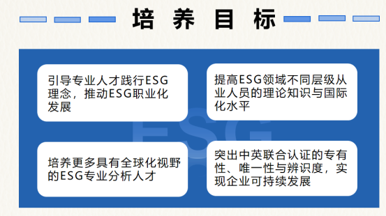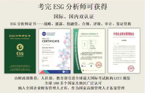 随着ESG理念的普及以及监管陆续要求企业披露ESG信息,围绕信息披露延展出了一系列需要,导致ESG领域的专业人才需求急剧增加。为了践行ESG理念,推动ESG职业化发展,提升ESG专业人才应具备的国际知识结构和实践水平,培养具有全球化视野的ESG专业人才,积极推动中国企业的社会责任履行和可持续发展,IAB英国伦敦工商会LCCI(简称IAB LCCI)与中国企业财务管理协会共同开展ESG分析师联合认证工作。
