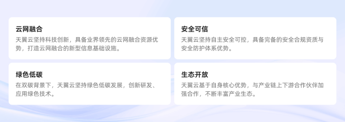 天翼云是中国电信倾力打造的云服务品牌,作为云服务国家队,以“云网融合、安全可信、绿色低碳、生态开放”四大优势向客户提供公有云、私有云、专属云、混合云、边缘云全栈云服务,满足政府机构、大中小企业数字化转型需求。