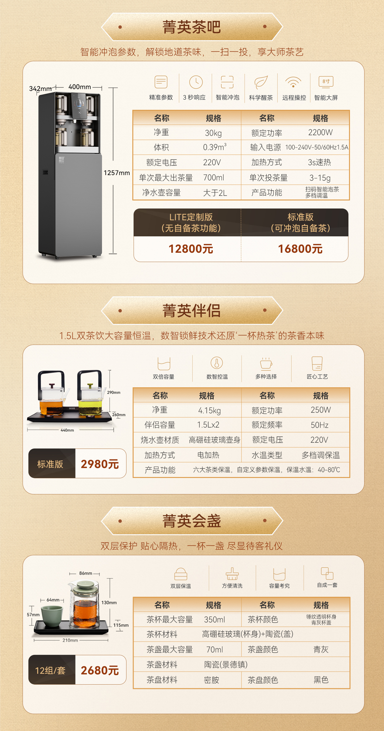 3、茶吧伴侣智能恒温,分类选按,工艺独特,美观牢固;智能设置茶水保温保香气时间和温度。