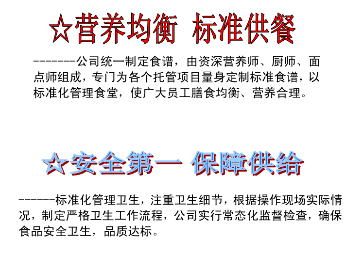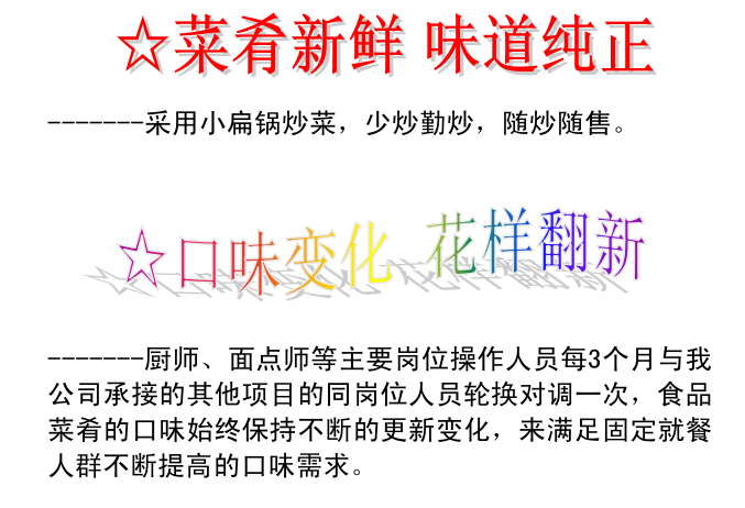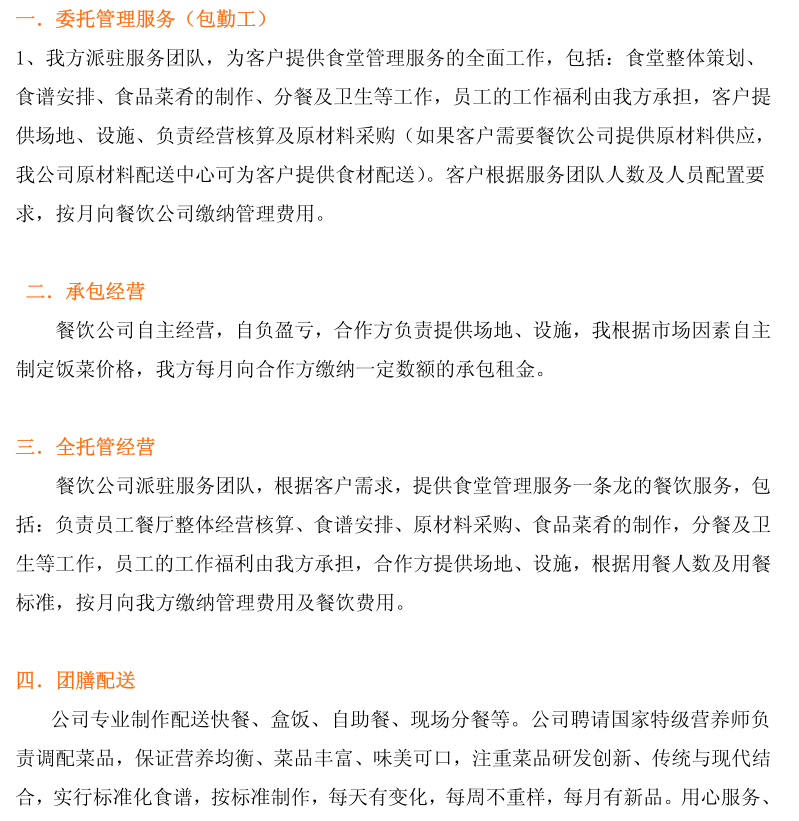 1.政府、企、事业单位食堂管理服务(包含新建食堂筹备、食材原料配送、日常供餐);