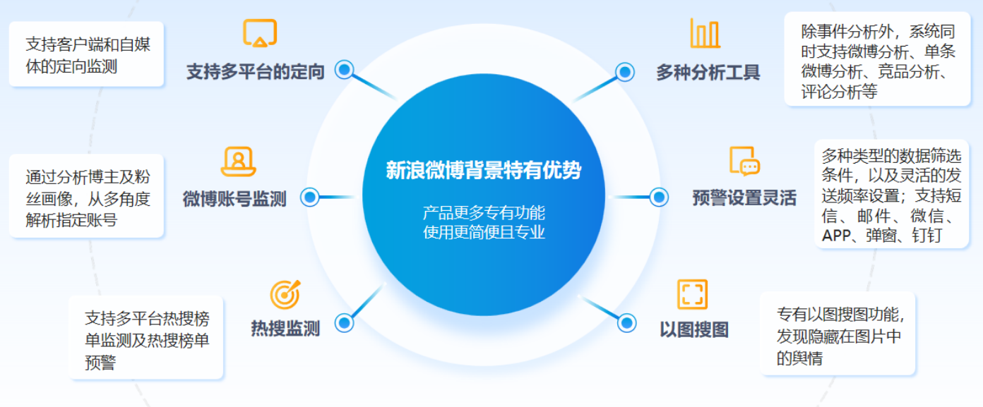 1.全网日新增文本数据5亿、视频3亿条,且有官方授权微博跟抖音数据,实现全网无死角监测;含境内主流新闻网站、短视频、论坛、贴吧、电子报、微博、博客、微信公众号、境外中文网站等;